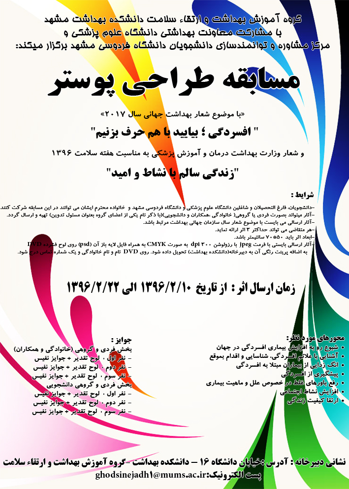 داوری مرحله نهایی مسابقه طراحی پوستر با شعار سال توسط دبیرخانه مسابقه روز پنج شنبه اول تیرماه در سالن شورای گروه آموزش بهداشت و ارتقای سلامت انجام شد.