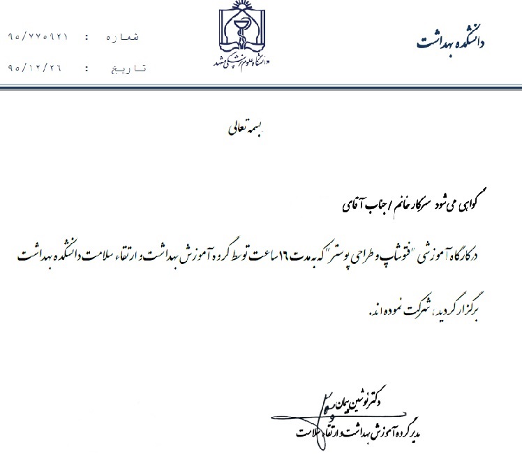 برای اولین بار در دانشکده بهداشت گواهی های حضور در کارگاه های آموزشی به صورت الکترونیکی صادر گردید.