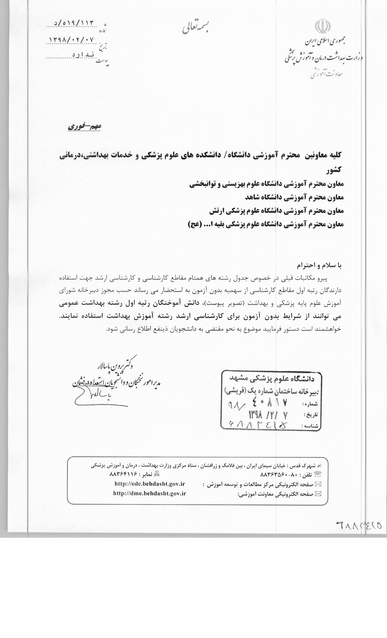 بر اساس نامه ارسالی از سوی وزارت بهداشت، درمان و آموزش پزشکی دانش آموختگان رتبه اول در رشته بهداشت عمومی می توانند از مزایای شرکت بدون آزمون در رشته آموزش بهداشت در مقطع کارشناسی ارشد استفاده نمایند.
