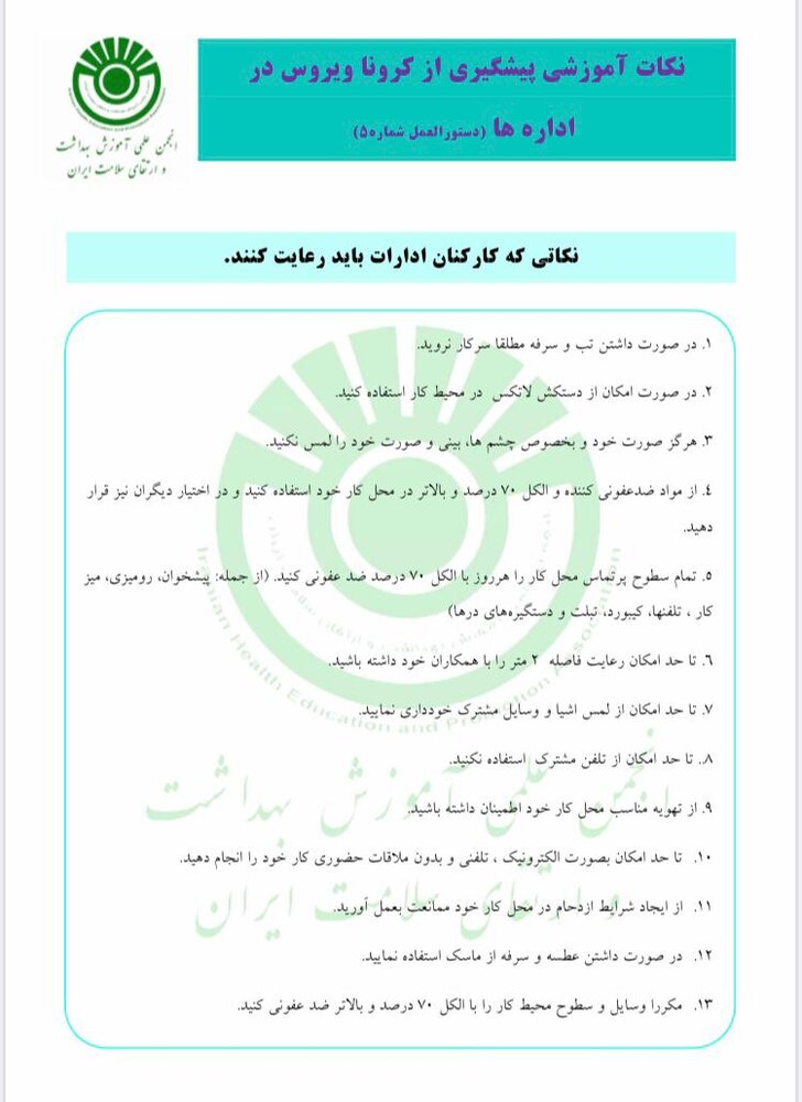 Hehp اخبار واطلاعيه ها 27 ارديبهشت 1399 بازدید: 135 امتیاز: ( 0 Rating ) نکات آموزشی پیشگیری از کرونا در ادارات امتیاز کاربران لطفا رای دهید رای 1 رای 2 رای 3 رای 4 رای 5 با وجود گسترش کرونا در روزهای اخیر و با توجه به تاکید بر رعایت بهداشت، انجمن علمی آموزشی بهداشت و ارتقای سلامت ایران دستورالعملی برای پیشگیری به این ویروس در ادارات صادر کرد. قبلی بعدی