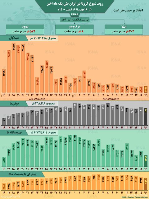 طبق اعلام وزارت بهداشت، ویروس کرونا تا ظهر دوشنبه (۱۶ اسفند ۱۴۰۰) هفت میلیون و ۹۶ هزار و ۳۱۸ نفر را در ایران به طور قطعی مبتلا کرده و در مجموع تا این روز ۱۳۸ هزار و ۱۱۶ نفر را به کام مرگ کشانده است. از سوی دیگر، شش میلیون و ۷۳۹ هزار و ۸۱۱ نفر در ایران تاکنون بهبود یافتهاند. بررسی آمارهای وزارت بهداشت نشان میدهد که طی ۱۰ روز اخیر (۷ تا ۱۶ اسفند ۱۴۰۰) به طور متوسط هر ساعت ۳۰۲ نفر در ایران مبتلا و ۸ نفر قربانی کرونا شدهاند و در هر ساعت ۵۷۲ نفر نیز بهبود یافتهاند. در این اینفوگرافیک روند شیوع کرونا در ایران طی یک ماه اخیر (از ۱۶ بهمن تا ۱۶ اسفند) را مشاهده میکنید.