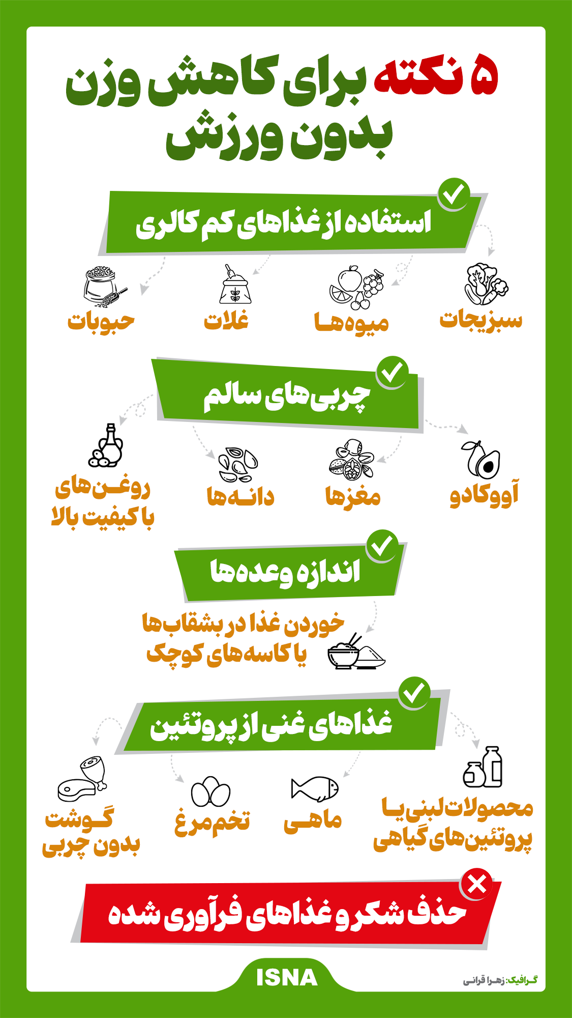 شواهد کافی حاکی از آن است که خوردن یک رژیم غذایی پرفیبر و پروتئین کلید اصلی کاهش وزن است. در این اینفوگرافیک به چند نکته اساسی برای دستیابی به وزنی ایدهال بدون ورزش اشاره شده است.